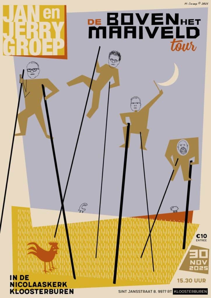 De nieuwe toer heet Boven het maaiveld. En dat doen ze ook…met veel oude bekende liedjes en een aantal gloednieuwe Jan & Jerry liedjes. Een verhaal over een dood schaap, over de bevrijding van Normandië, een Ukelesong. En natuurlijk zijn Natte klei, Ik doe maar wat, Septemberkinderen en Deuren ook weer te horen.